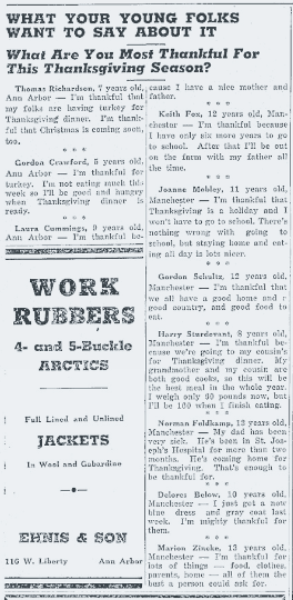 Seven-year-old Thomas Richardson from Ann Arbor took a straightforward approach. He was thankful that his family “have turkey for Thanksgiving dinner” and that Christmas was just around the corner. Five-year-old Gordon Crawford, also from Ann Arbor, showed remarkable discipline for someone in kindergarten. He reported he wasn’t eating much all week so he could be “good and hungry when Thanksgiving dinner is ready.”