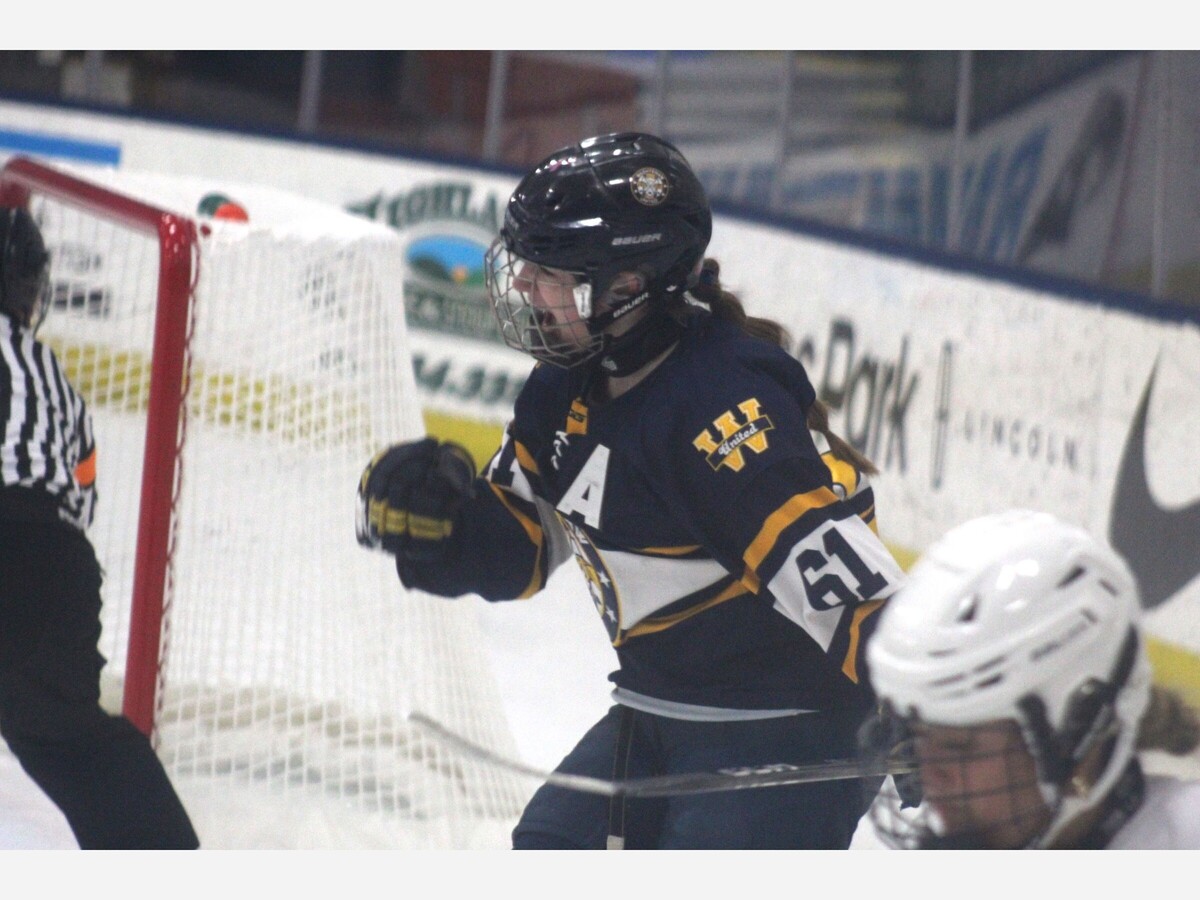 Sydney Clark celebrates her goal to make it 2-0 Washtenaw. Photo by Mike WilliamsonWashtenaw was called for roughing a few minutes later to put the Cranes on the power-play, but it was United who struck with a girl down when Sydney Clark took a pass from Lily Schlack and broke in on net lifted a shot that bounced off the goaltenders shoulder and into the net for a shorthanded goal to make it 2-0 with 4:02 left in the first.