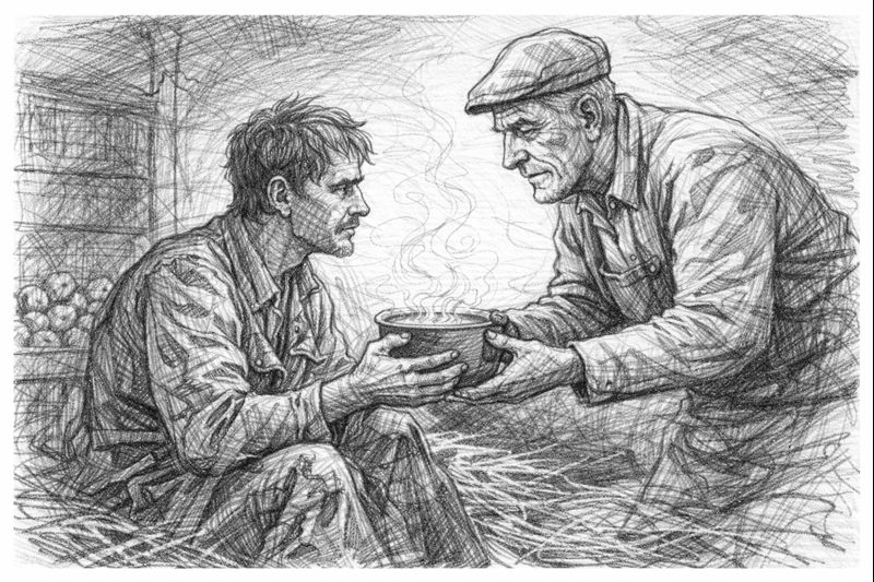 That night the farmer brought him a meal, a bar of soap, and ointment for his sores. Walther bandaged his feet with strips of burlap.