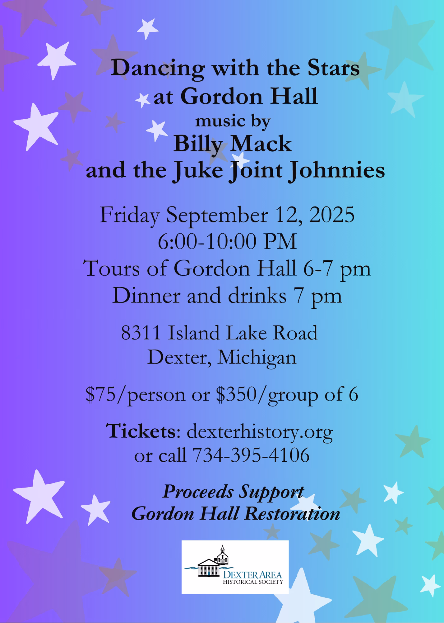 Friday, September 12. 6-10 pm. Doors and the bar open at 6:00 pm. Historic Gordon Hall will be open for you to explore the first floor only from 6-7:00 pm. After a short program beginning at 7:00, you can dance the night away under the tent to the sounds of local favorite Billy Mack and the Juke Joint Johnnies. Enjoy dinner and open bar with beer, wine, and soft drinks until 10:00. Tickets are $75 per person or $350 for 6 people. Advance purchase is suggested. Location: Gordon Hall, 8311 Island Lake Rd, at the corner of Dexter-Pinckney Rd, Dexter, MI. To buy tickets or for more information call 734‑395-4106 or visit www.dexterhistory.org All proceeds benefit the restoration of Gordon Hall.
