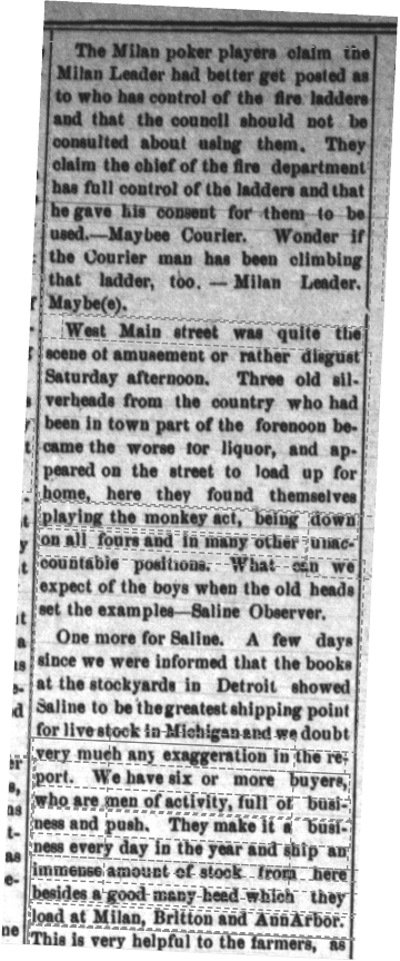 Meanwhile, the Saline Observer reported that West Main Street was lively on Saturday afternoon when “three old silverheads from the country” overindulged and began “playing the monkey act” in the street, down on all fours and in other “unaccountable positions.” The editor sighed, “What else can we expect of the boys when the old heads set the examples?”