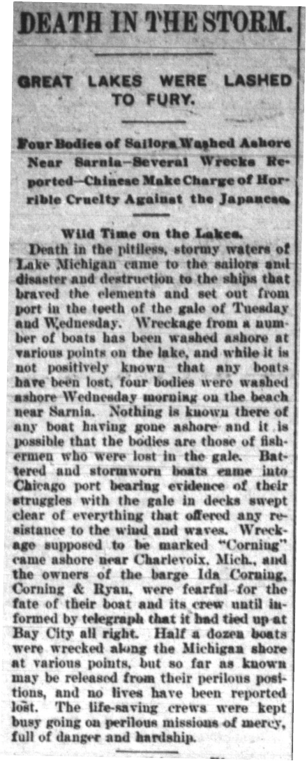 Farther north, the Chelsea Standard told of grimmer scenes. A furious November gale tore across the Great Lakes, wrecking ships and claiming sailors’ lives. Four bodies washed ashore near Sarnia, and wreckage littered Michigan’s coast from Charlevoix to Bay City. The paper called it a “wild time on the lakes,” with storm-battered boats limping into Chicago and lifesaving crews battling “perilous missions of mercy.”