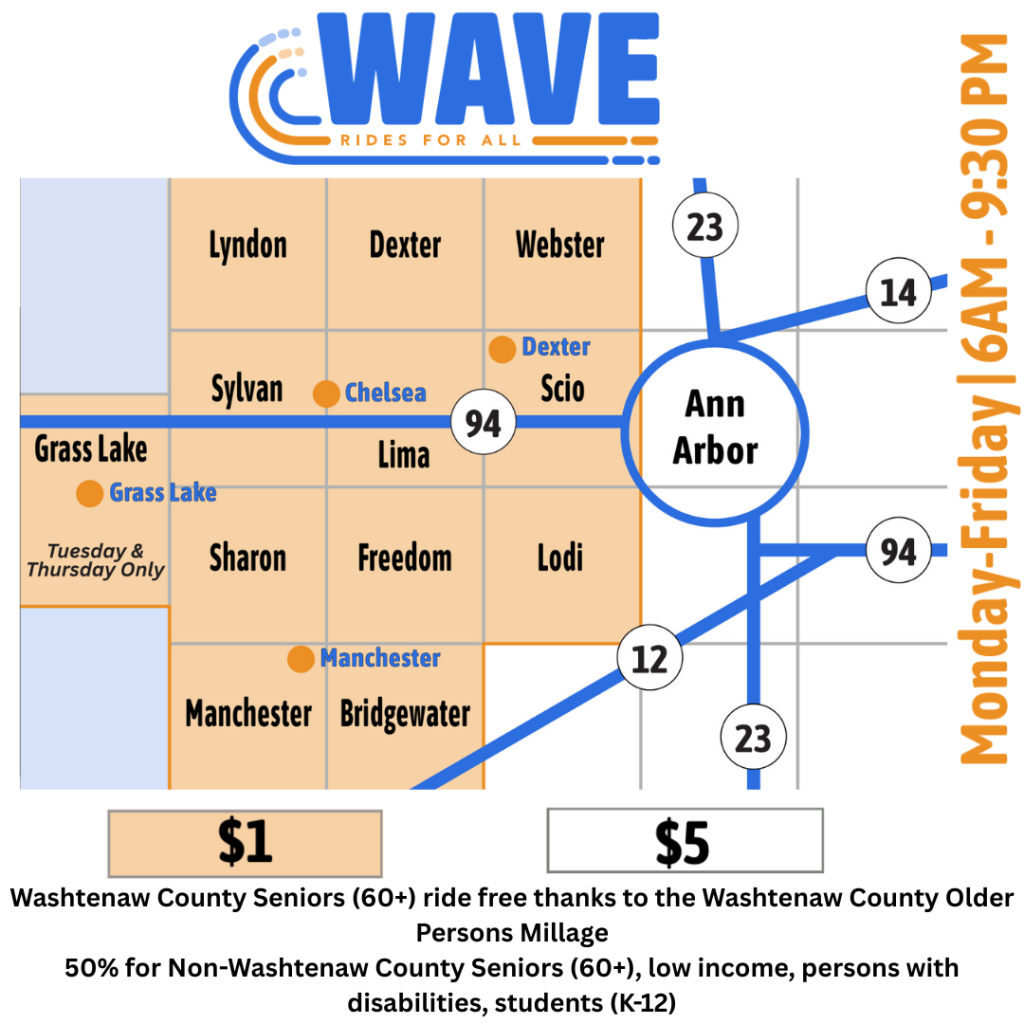 WAVE covers greater Western-Washtenaw with routes in communities such as: Webster, Scio, Dexter Township, City of Dexter, Lyndon, City of Chelsea, Sylvan and Lima.