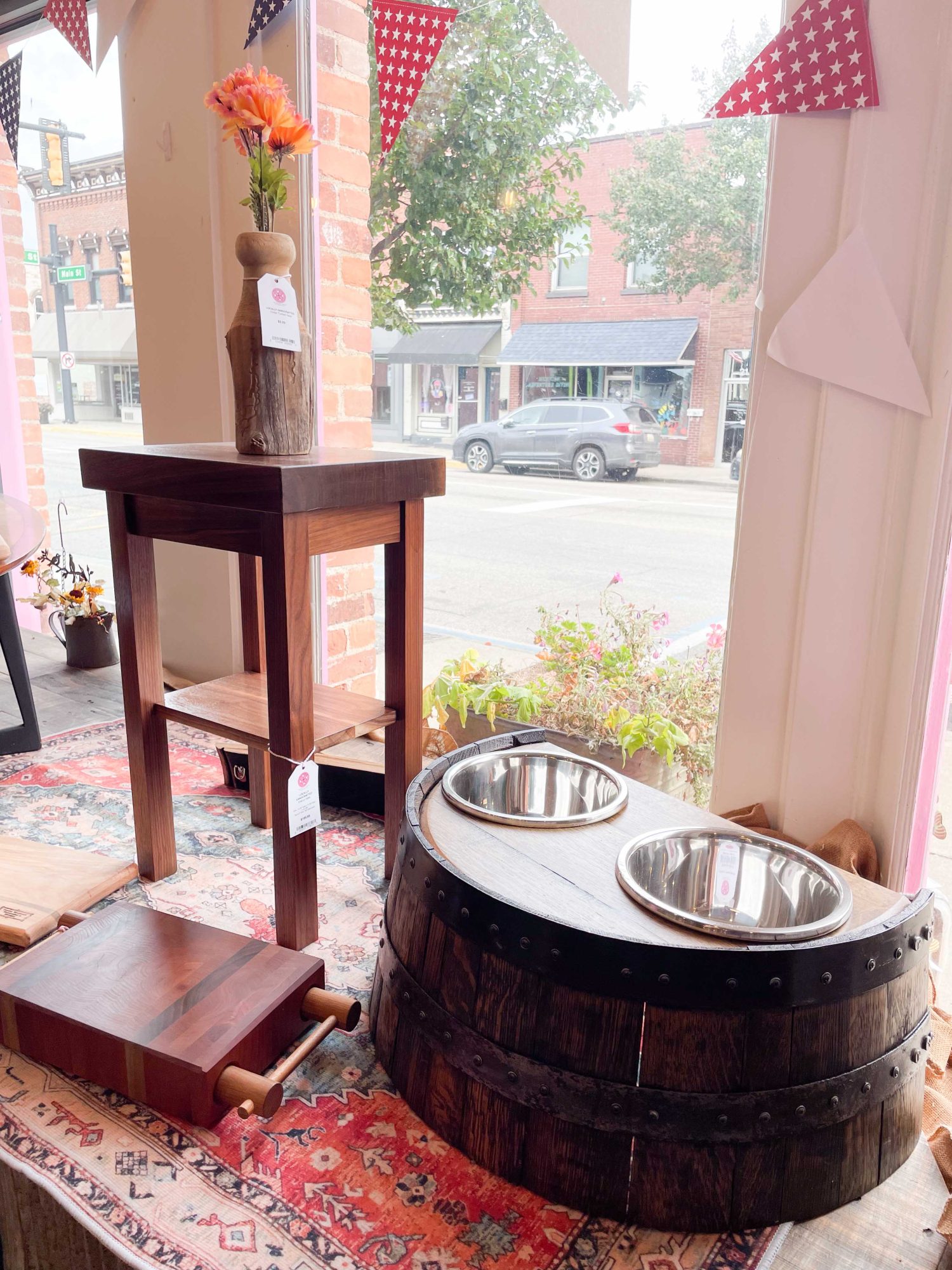 Gordon has been sharing space with his wife, Rita Gordon who owns Pink Shamrocks next door, but had been asking landlord Dave Snyder about availability along Main Street. Gordon previously operated a shop by the same name in Dearborn, where he sold his lumber and handmade furniture, along with his bourbon barrel creations. He makes tables and other items out of the barrels, upcycles the metal bands into lamps and even sells the leftover shavings for BBQ.
