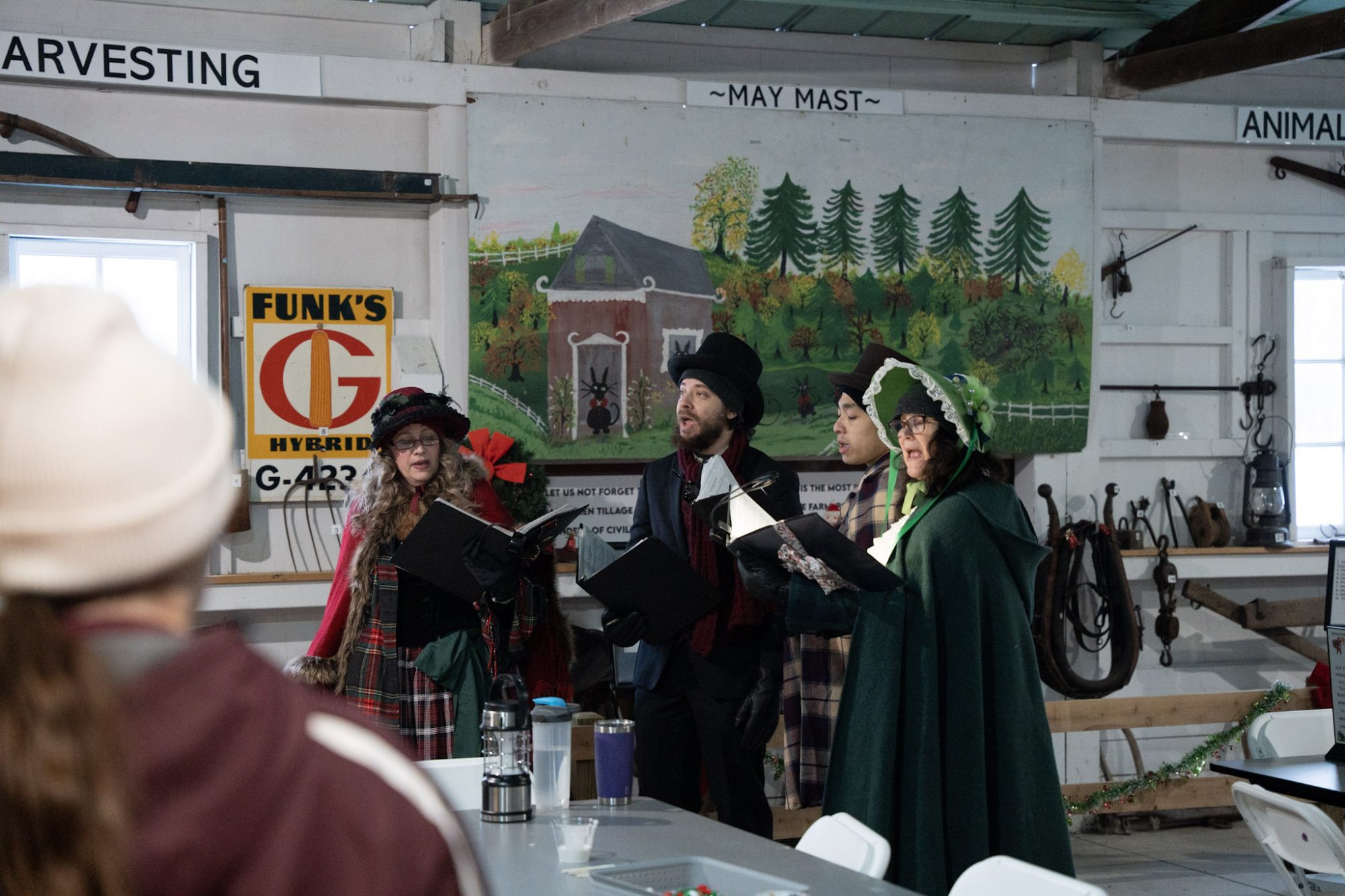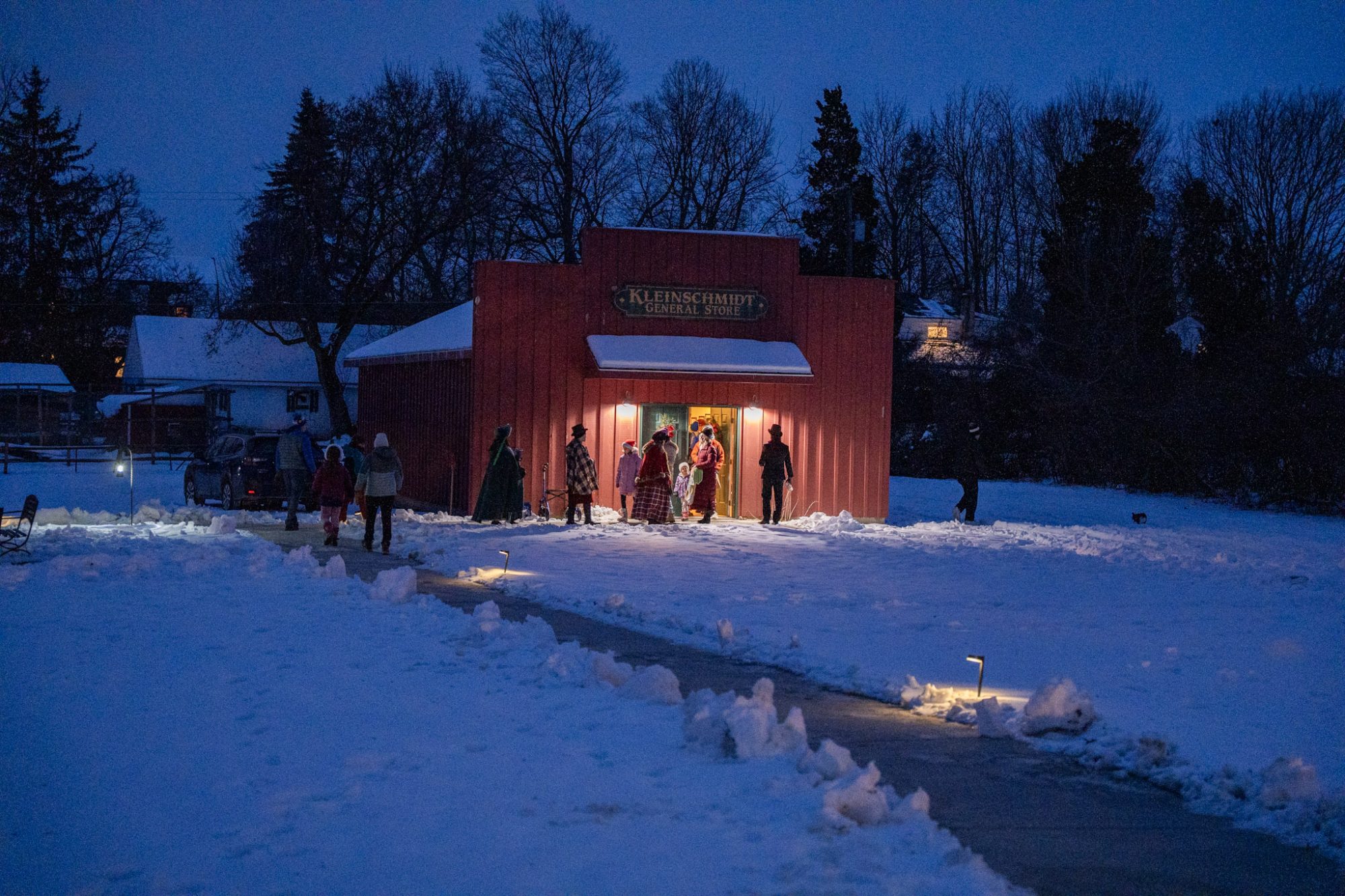 The Village was lit by luminaires which reflected a warm glow in the snow. Candles shone in the historic buildings and a huge Christmas tree, filled with light, stood on stage at the Dieterle Corncrib. The Arbor Consort brought music as they strolled throughout the village.