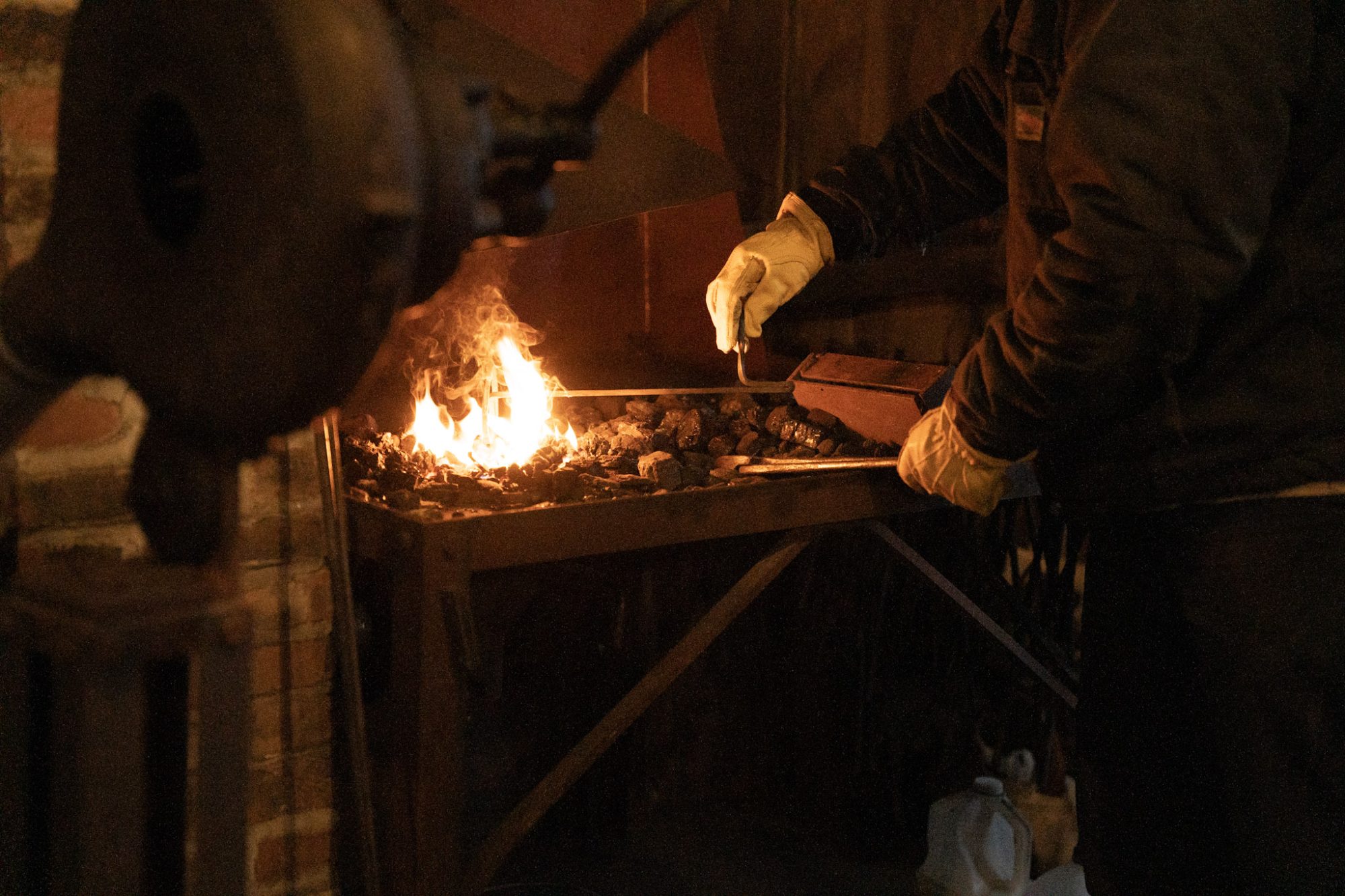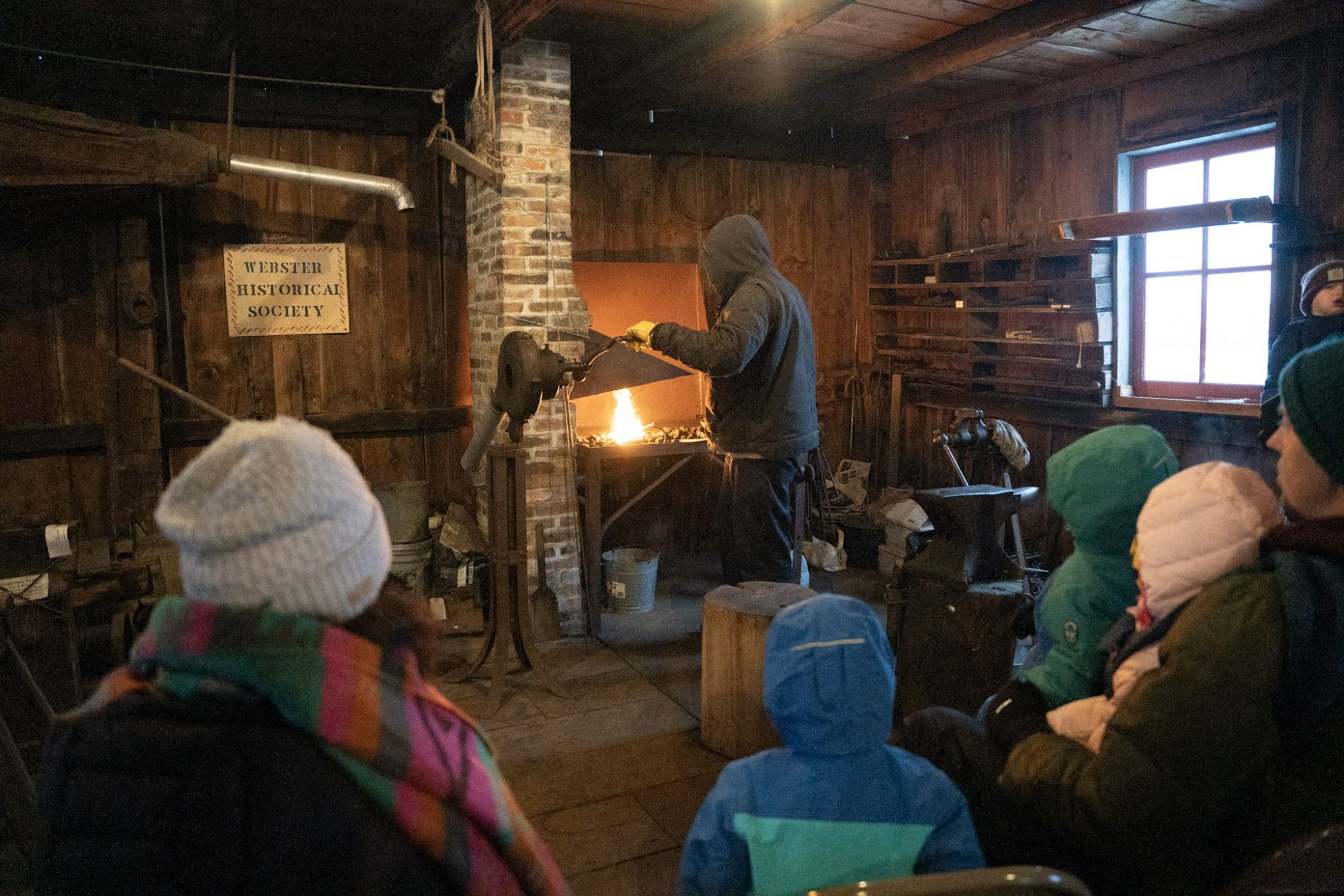 The Blacksmith Shop, a longtime visitor favorite, drew steady interest throughout the evening. Inside, the village smithy stood over the forge making his magic with fire, anvil, and hammer and tongs.