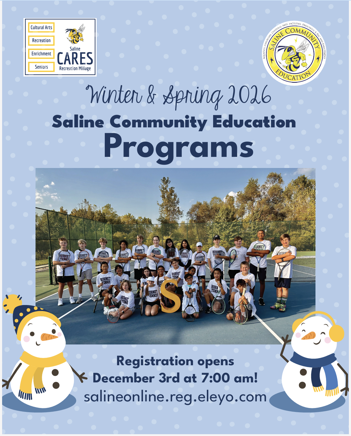 Saline Community Education will open registration for its Winter & Spring 2026 programs on Tuesday, December 3 at 7:00 a.m., offering families and residents a wide range of enrichment, recreation, arts, and educational opportunities for all ages.