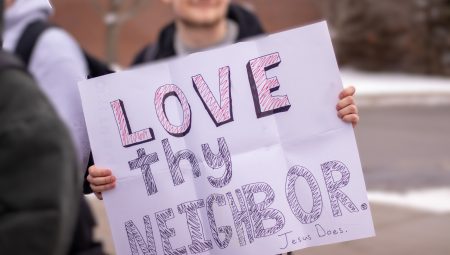In Dexter, the walkout unfolded in the school’s amphitheater-style courtyard, where students gathered with signs reflecting a range of civic and religious messages, including “Love Thy Neighbor” and “AP Gov Taught Me This Is Not Okay.”