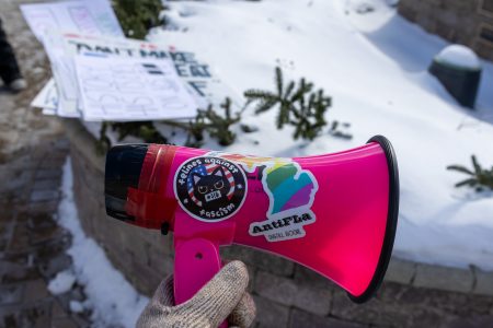 A pink megaphone used by students during a walkout outside Milan High School. Students organized the event in response to concerns about immigration enforcement and civil liberties. Photo by Amy Lozen