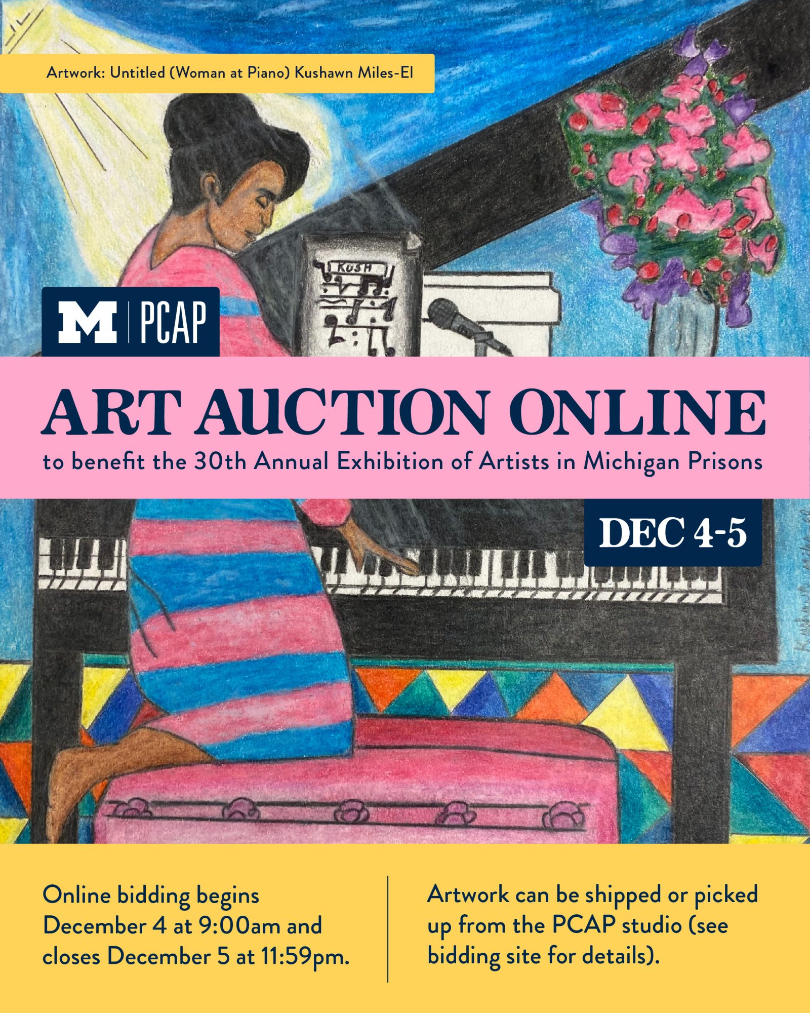 The Prison Creative Arts Project (PCAP) will hold its annual online art auction beginning at 9:00 a.m. on Wednesday, December 4, and closing at 11:59 p.m. on Thursday, December 5. The bidding link will be posted at 9:00 a.m. on December 4 at http://myumi.ch/z9x3R, where visitors can also find full event details.