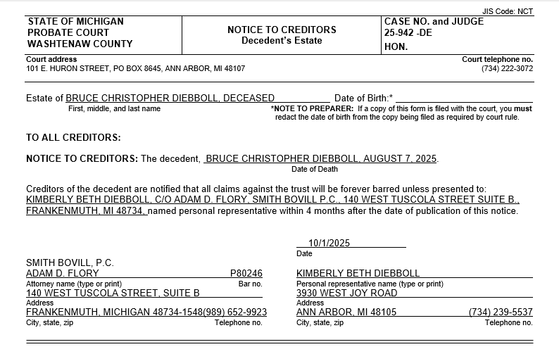 October 3, 2025 STN Staff Public Notices Washtenaw County: Notice to Creditors Latest articles Washtenaw County: Notice to Creditors STN Staff Step Into the Spotlight: Join Ballet Chelsea’s Partner with Us Campaign STN Staff UPCOMING EVENTS Oct 3 5:00 pm - 7:00 pm Natural Dye Workshop at Community Farm of Ann Arbor Oct 3 5:00 pm - 10:00 pm Backyard Beer Garden Oct 3 6:00 pm - 9:00 pm Kids & Teens Taylor Swift Album Listening Party Oct 4 8:00 am - 12:00 pm Saline Farmers Market Oct 4 8:00 am - 12:00 pm Coffee Off by Edward Jones of Milan View Calendar Add Event