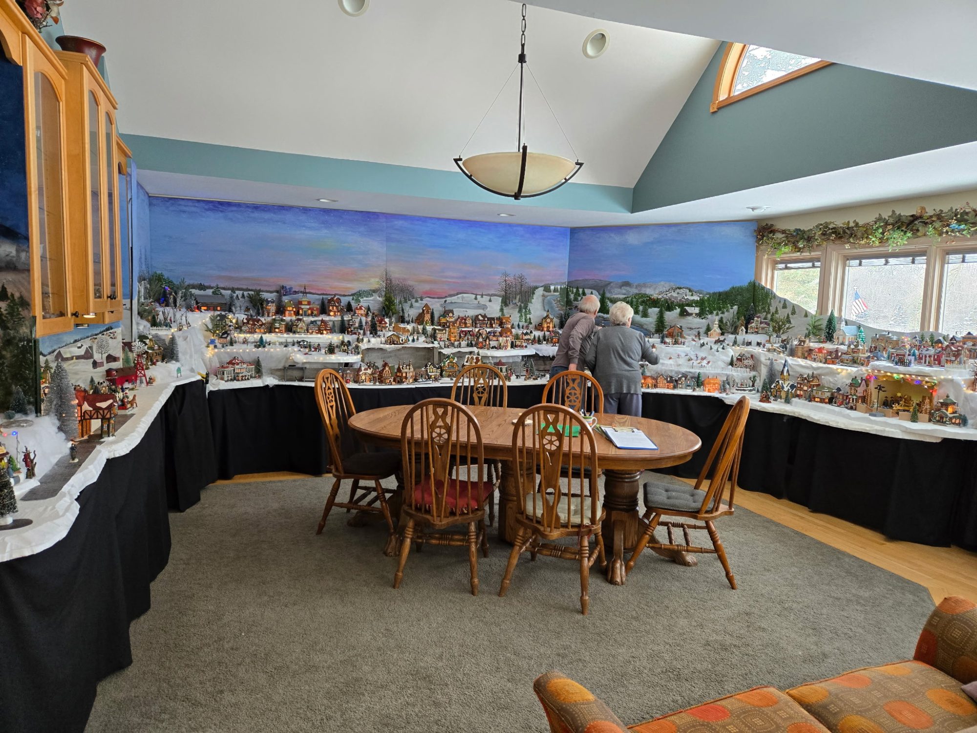 Elsi’s passion for creating the villages started with a winter weekend trip to Petoskey with friends in the mid-1980’s. Most went cross-country skiing, but a friend decided to go shopping downtown with Elsi and discovered Department 56 Christmas cottages. Elsi bought four and displayed them on the grand piano.