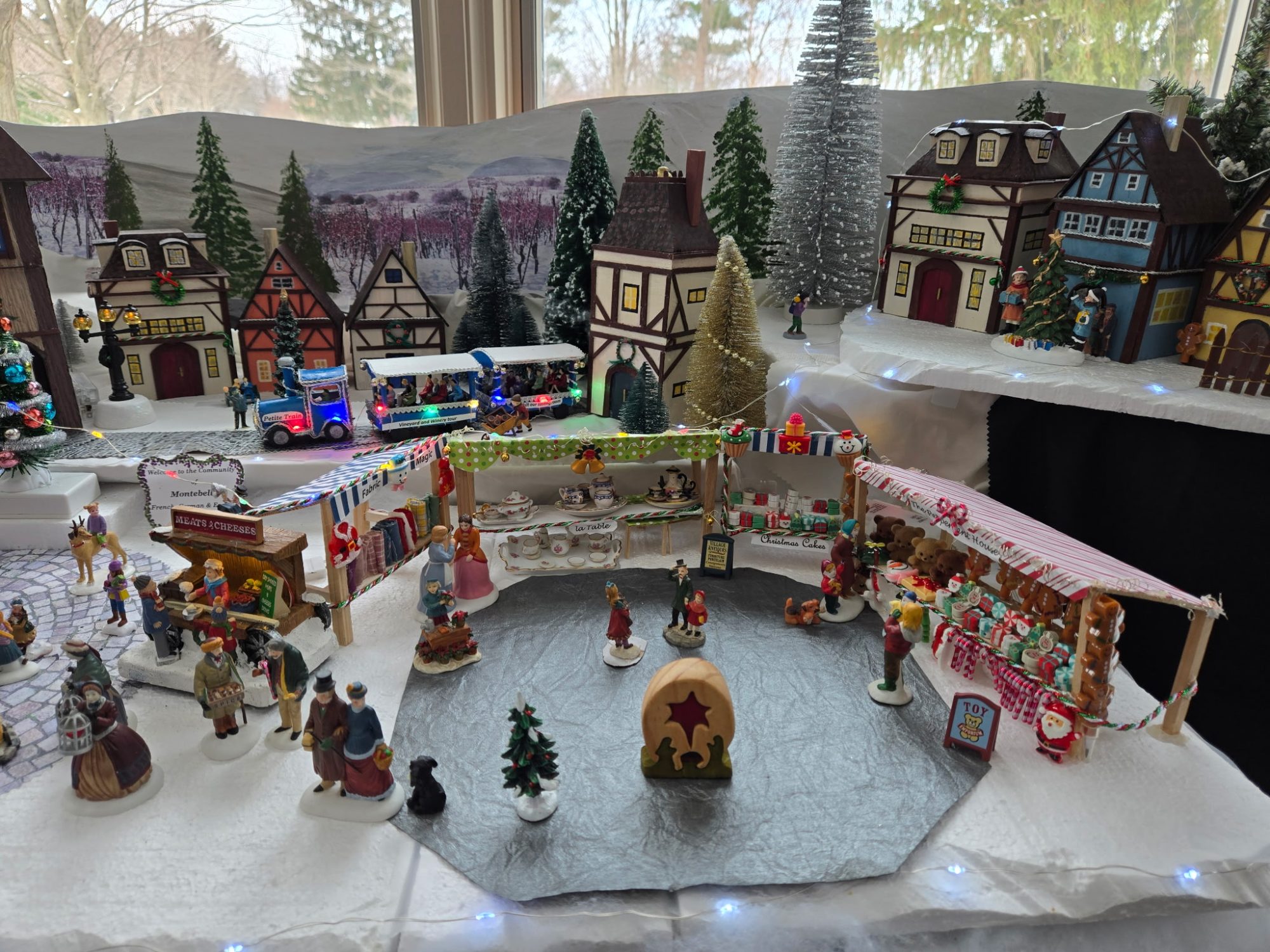 Christmas lights shimmer in windows bedecked with wreathes. Carolers wander down village lanes singing. A young man has dropped onto one knee to propose to a delighted woman. Families of all ages gather to decorate trees on a village green. Choirs sing to the heavens near a nativity scene. Farmers tend their herds and flocks by lantern light. Others tap maple trees outside a cozy sugar house. Children cling to sleds as they careen down a snow-covered hill, while in the distance, skiers slalom and snowplow their way to a cozy inn. Carousels spin. A Christmas train filled with happy passengers winds its way through the valley, while an ancient locomotive arrives with holiday visitors. And everywhere, charming Christmas villages and farms range across Michigan-style hills.