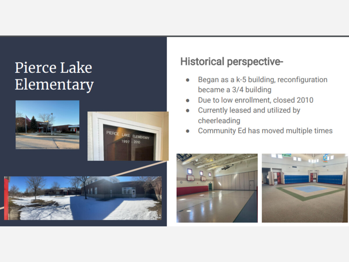 Phase One is called “Pierce Lake – Early Childhood and Community Education Center.” Its goals are to find permanent location for Community Education, Preschool, and Aftercare, and reopen Pierce Lake Elementary. The timeline for this phase is January through August.
