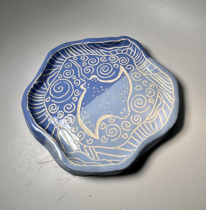 Neve Rodriguez, ninth grade, described her piece as a plate she made in Ceramics 1. She said it shows how she feels about sea life.