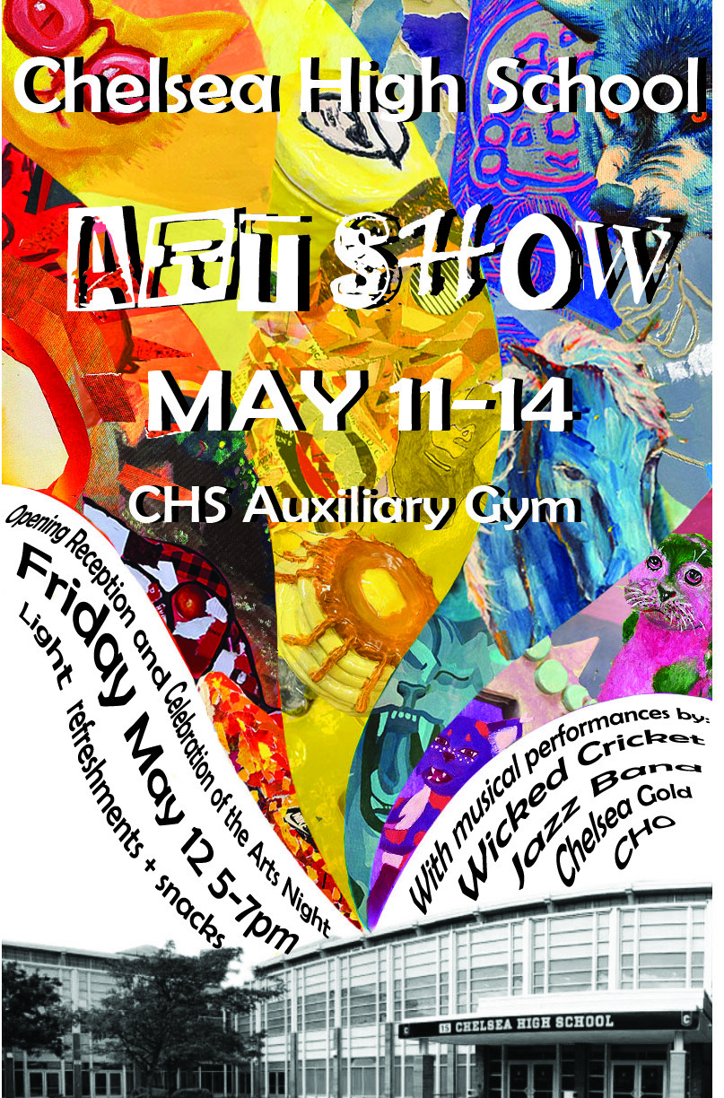 CHS’s Art Show is open on Thursday, May 11 - Sunday, May 14 with an opening reception from 5 to 7 p.m. on Friday, May 12, where there will be music performances by student band Wicked Cricket, Chelsea CHO, Jazz Band, and Chelsea Gold. The event takes place at Chelsea High School in the Auxiliary Gym, and anyone and everyone is invited to attend.
