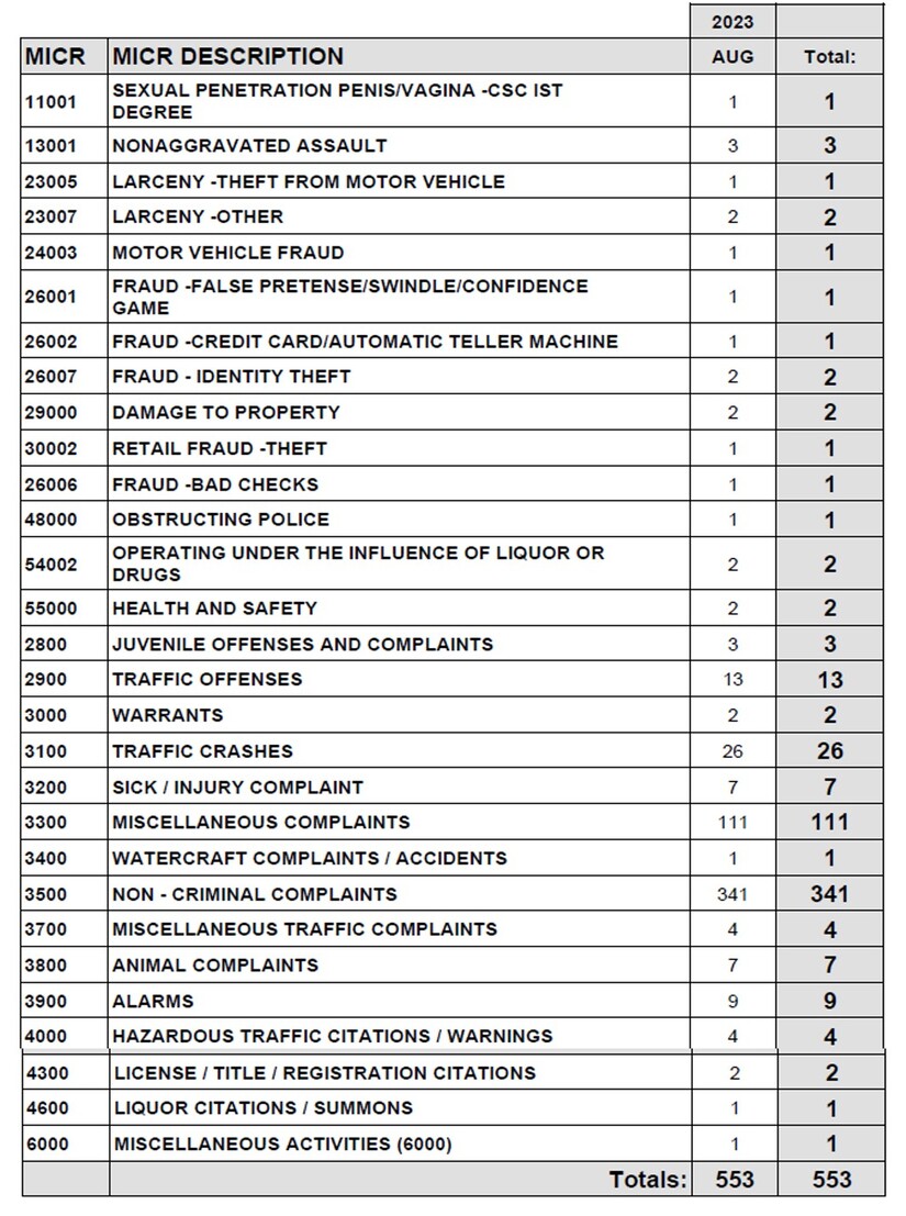In August 2023, Officers responded to 553 calls for police service, up from 415 the previous year for a 33% increase. Total calls for 2023 (Jan-Aug) are 3,525, up from 2,669 for the same period last year for a 32% increase.