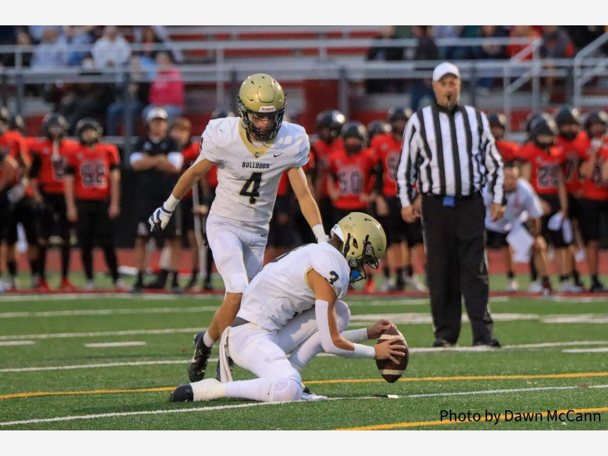 The Bulldogs came up with what may be the drive of the season as they moved 83 yards and scored on a two-yard TD run by Luke Anstead. They converted the two-point conversion pass from Anstead to Tyson Hill to cut the lead to 14-11 with two minutes remaining.