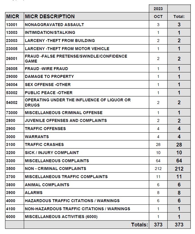 In October 2023, Officers responded to 373 calls for police service in the City of Chelsea, down from 447 the previous year for a 17% decrease. The total calls for 2023 (Jan-Oct) are 4,330, up from 3,657 for the same period last year, an 18% increase.
