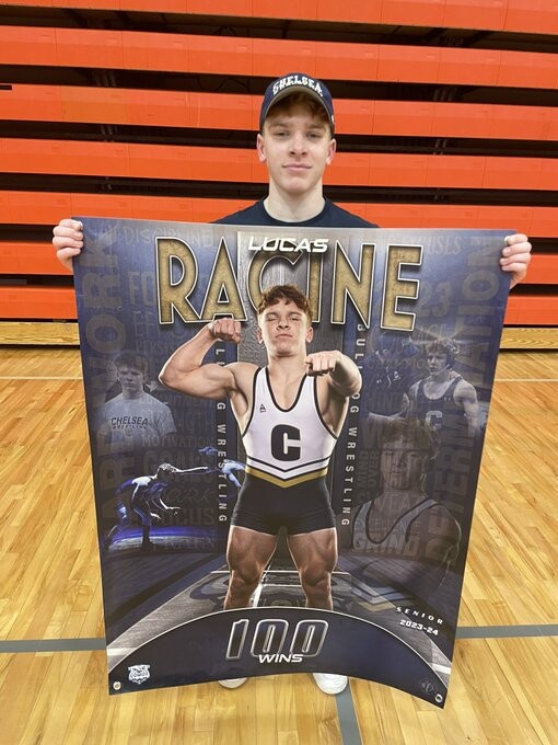 Lucas Racine picked up his 100th career win at Tecumseh. Photo provided by Chelsea WrestlingEvan Muchler (113), Massimo Culgliari (157), and Thomas Shemwell (165) each earned third-place finishes, while Collin Beckel (106), Chase Messersmith (138) and Donavan Fisk (285) all finished fourth for Chelsea.