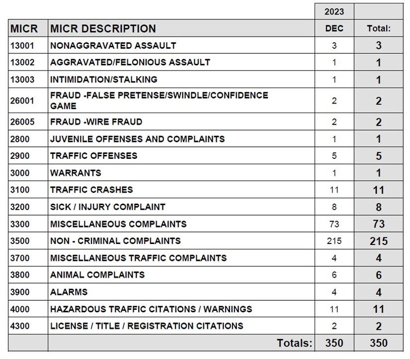 In December, Officers responded to 350 calls for service in the City of Chelsea, down from 352 the previous year. Total calls for 2023 (Jan-Dec) are 5,021, up from 4,331 for the same period last year, a 16% increase.