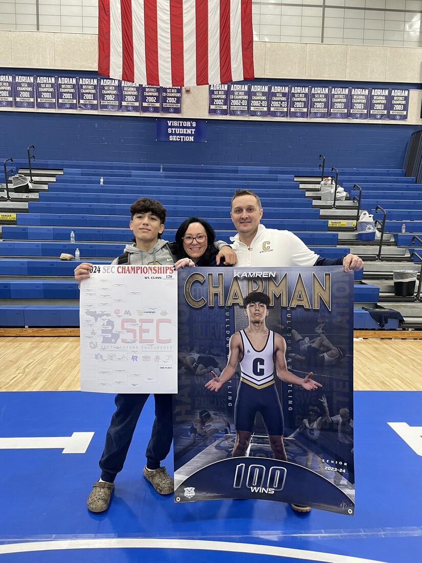 Kamren Chapman eanred his 100th career win on his way to the 120-pound league title.Lucas Racine beat his Bedford opponent with a 12-2 major decision to claim the 132-pound title. He also had a pair of pins to reach the finals and improved to 31-4 on the season.