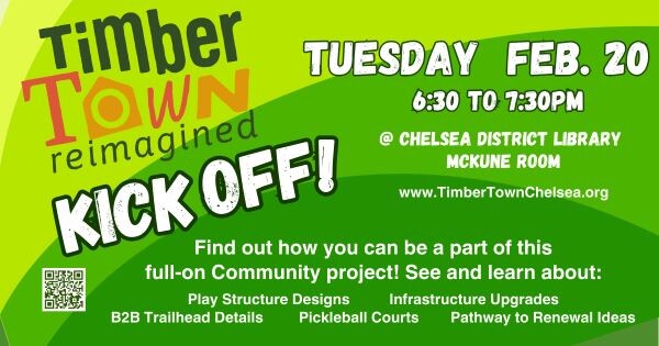 The kick off for this unique community-wide project will be held on Feb. 20, at 6:30pm to 7:30pm, in the Chelsea District Library’s McKune Room. The “build week” is scheduled for Aug. 6 to 11, 2024. At the kickoff, community members will be able to learn more about the overall project, watch the premiere of the TimberTown Reimagined video, see the new playground designs, and sign up to volunteer.