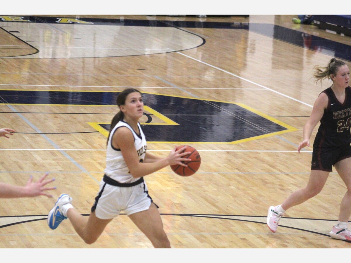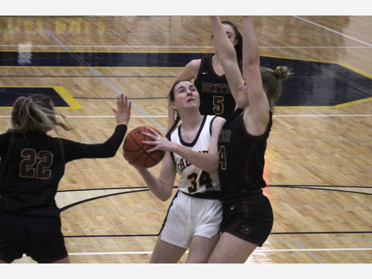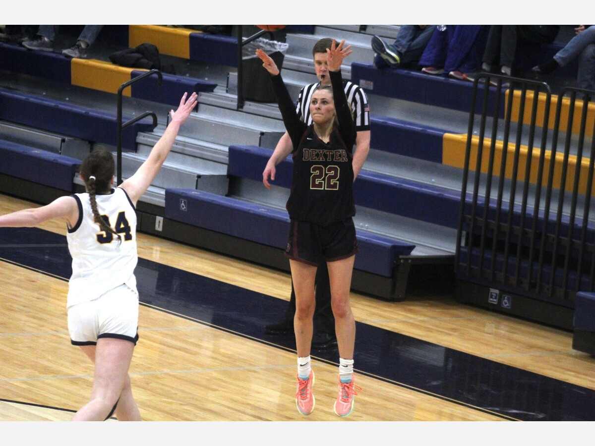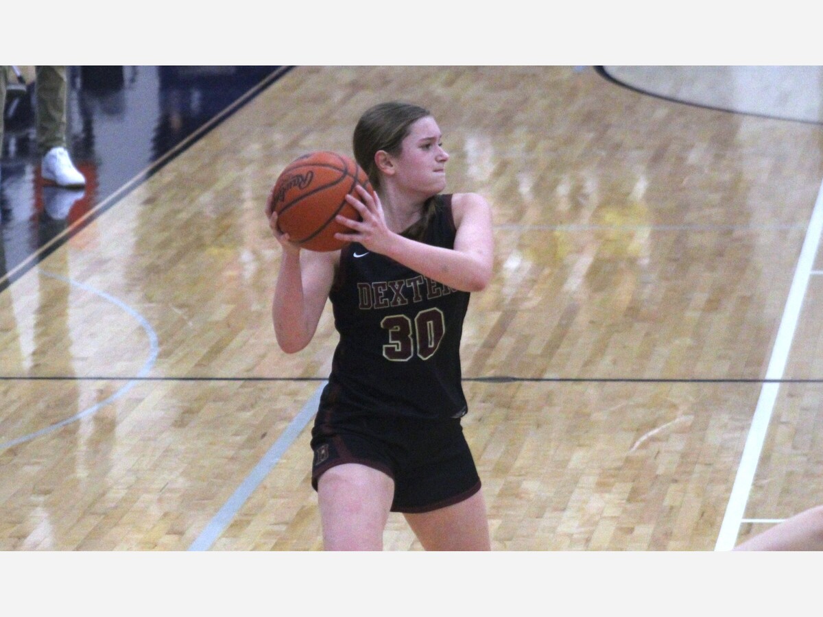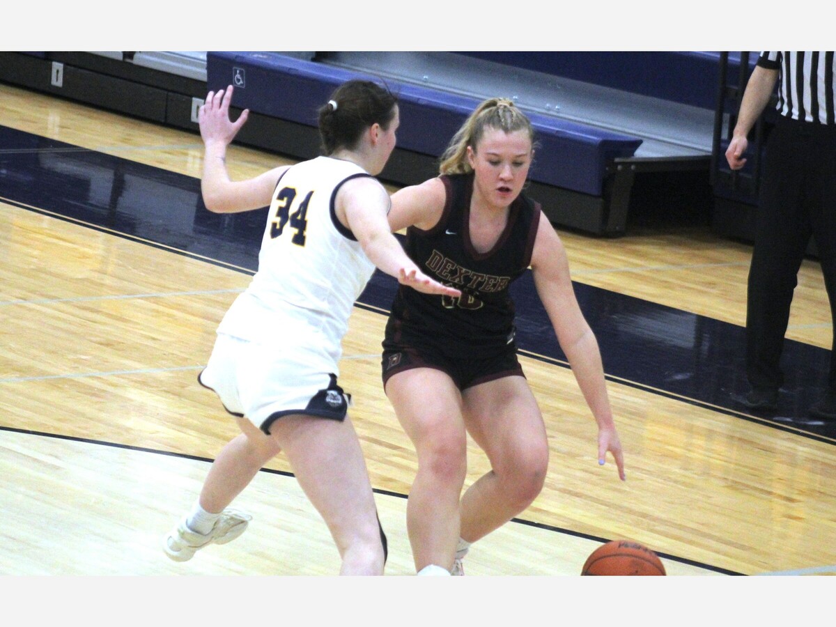 Alena Blumberg led Dexter with 15 points. Photo by Mike WilliamsonLay finished with 16 points for the Bulldogs. McKale hit three triples for nine points, while Braiden Scheffler added two and Aleeah Wells one.