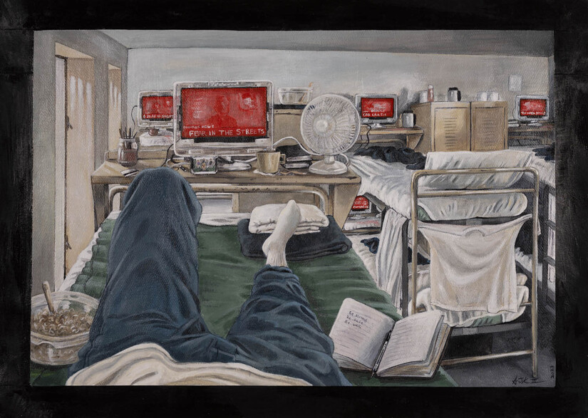 Humor was one of the themes PCAP's staff uncovered during the design meeting, like "Dreaming of a Way Out/Wishful Thinking" by artist Radu. This small watercolor illustration shows the perimeter of a prison. Inside the prison yard, a UFO is beaming prisoners up into outer space and away from thinking, while outside the prison, a unicorn watches.