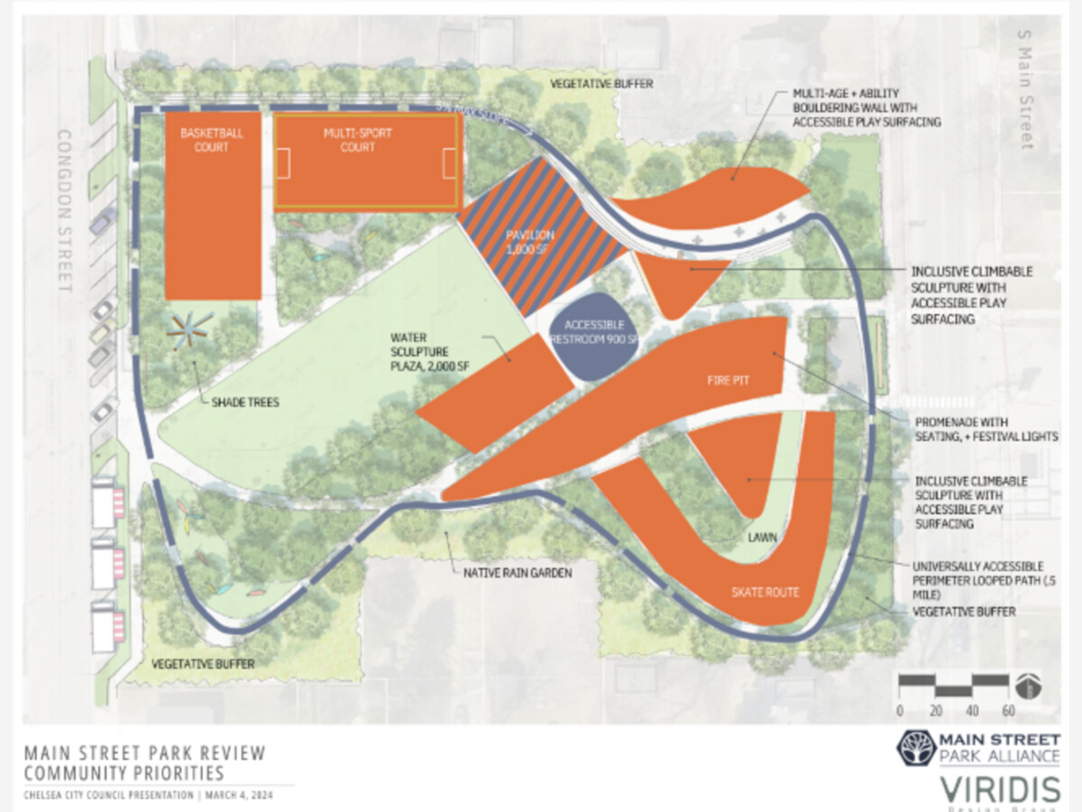 MSPA states in its newsletter, “As reported in our last update, according to the National Recreation and Parks Association, a community the size of Chelsea should have 56 acres of parkland. Chelsea has 35 acres, nearly 40% less than the national standard; most of this parkland is located on the periphery of the population center, and much of that acreage is wooded or wetlands. The total acreage associated with Main Street Park is 2.82 acres, dropping the deficit to 32%, and this park is located within the city center. The park overview below identifies the allocation of specific amenities and activities space.”