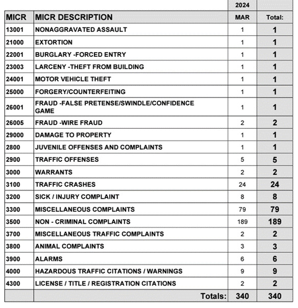In March 2024, Officers responded to 340 calls for police service in the City of Chelsea, down from 473 the previous year, a 22% decrease. Total calls for 2024 (Jan-Mar) are 1,044, down from 1,280 for the same period last year, an 18% decrease.