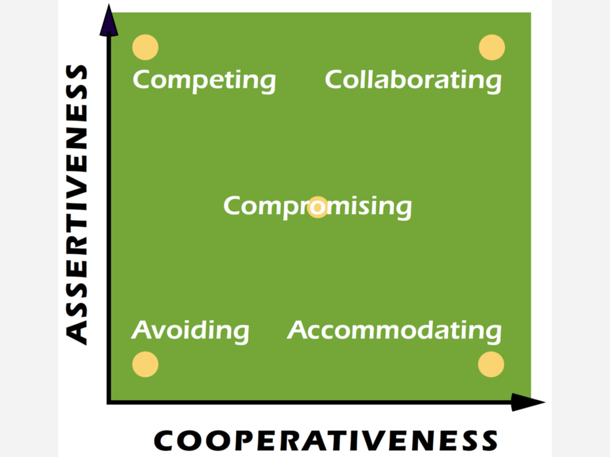 Conflict resolution specialists often look to the five approaches to conflict outlined by Thomas-Killman: competition, avoidance, accommodation, compromise, and collaboration. Each of these has an element of assertiveness and cooperativeness.