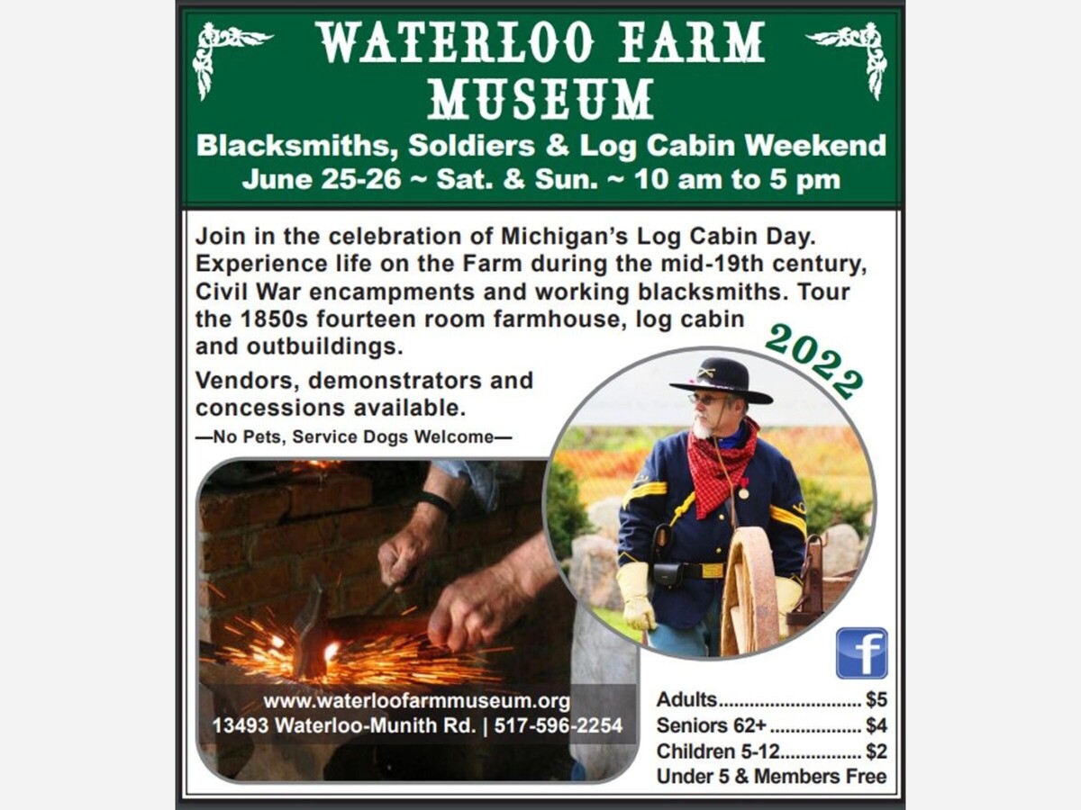 Celebrate Blacksmiths, Soldiers, and Log Cabin Weekend at the Waterloo Farm Museum. Join us in commemorating over 100 historic log cabins on Michigan Log Cabin Day Sunday, June 26. Working blacksmiths, at their forges, will demonstrate and display their practical and artistic wares. A Civil War encampment, with cannon, will be on the grounds depicting the life of a soldier.
