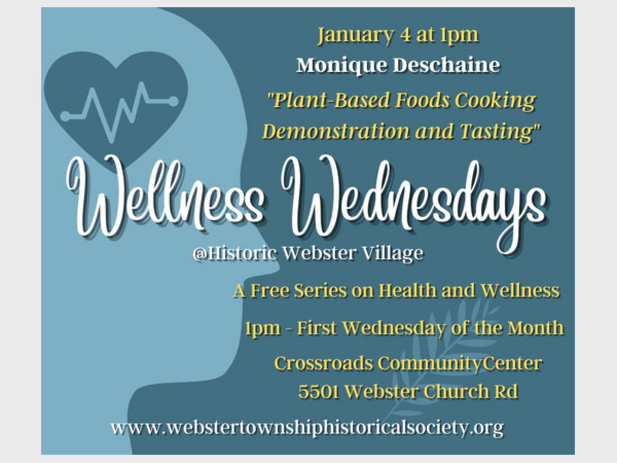 Wellness Wednesdays, a free series on health and wellness sponsored by the Webster Township Historical Society, takes place on the first Wednesday of the month at 1pm in the Crossroads Community Center at Historic Webster Village. January's event will feature Monique Deschaine, founder of the Al Dente Pasta Company, demonstrating plant-based cooking.