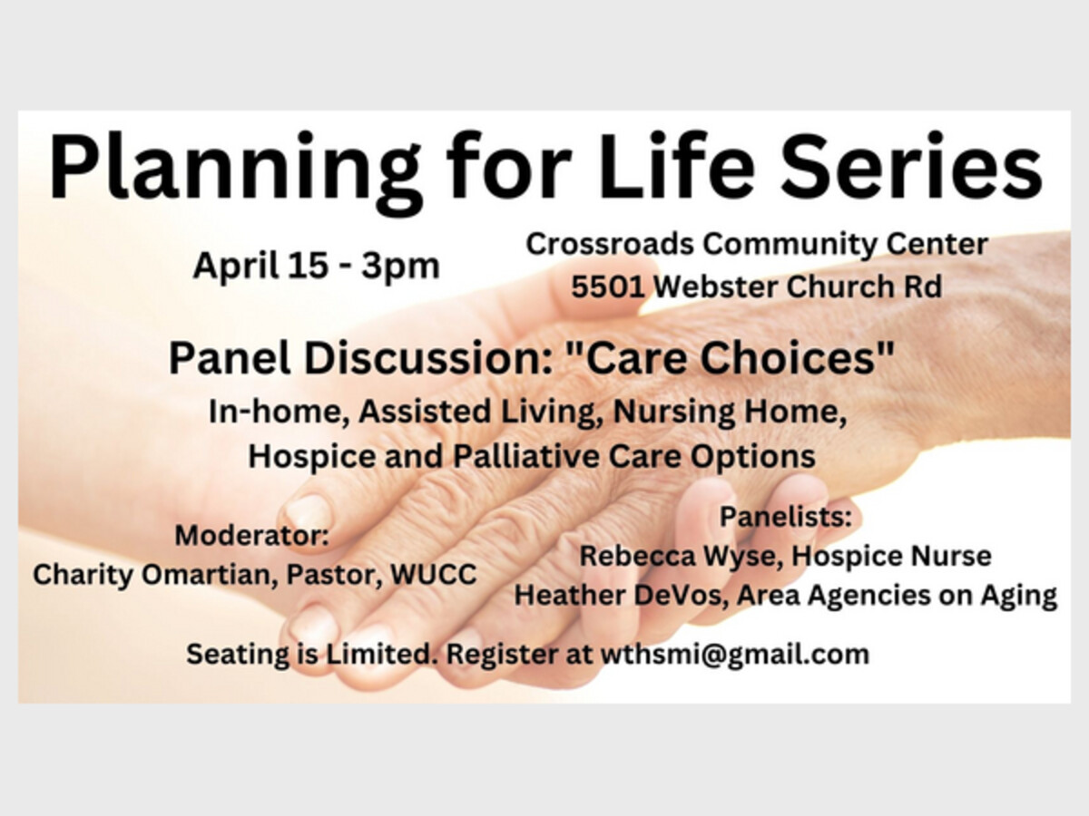 The Planning for Life Series, co-sponsored by the Webster Historical Society and the Webster United Church of Christ, will address important decisions that we will all encounter as we, or our loved ones, come to the end of our lives. On April 15, Pastor Charity Omartian will join panelists Rebecca Wyse and Heather DeVos to discuss Care Choices including in-home, assisted living, nursing home, hospice and palliative care options.Seating is limited. Register at [email protected].