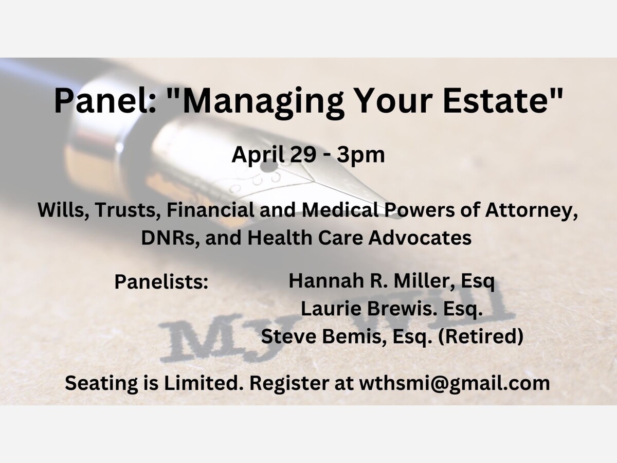 The Planning for Life Series, co-sponsored by the Webster Historical Society and the Webster United Church of Christ, will address important decisions that we will all encounter as we, or our loved ones, come to the end of our lives. On April 29, a panel of lawyers, experts in estate planning, will discuss wills, trusts, financial and medical powers of attorney, DNRs and health advocates. Seating is limited. Register at [email protected].