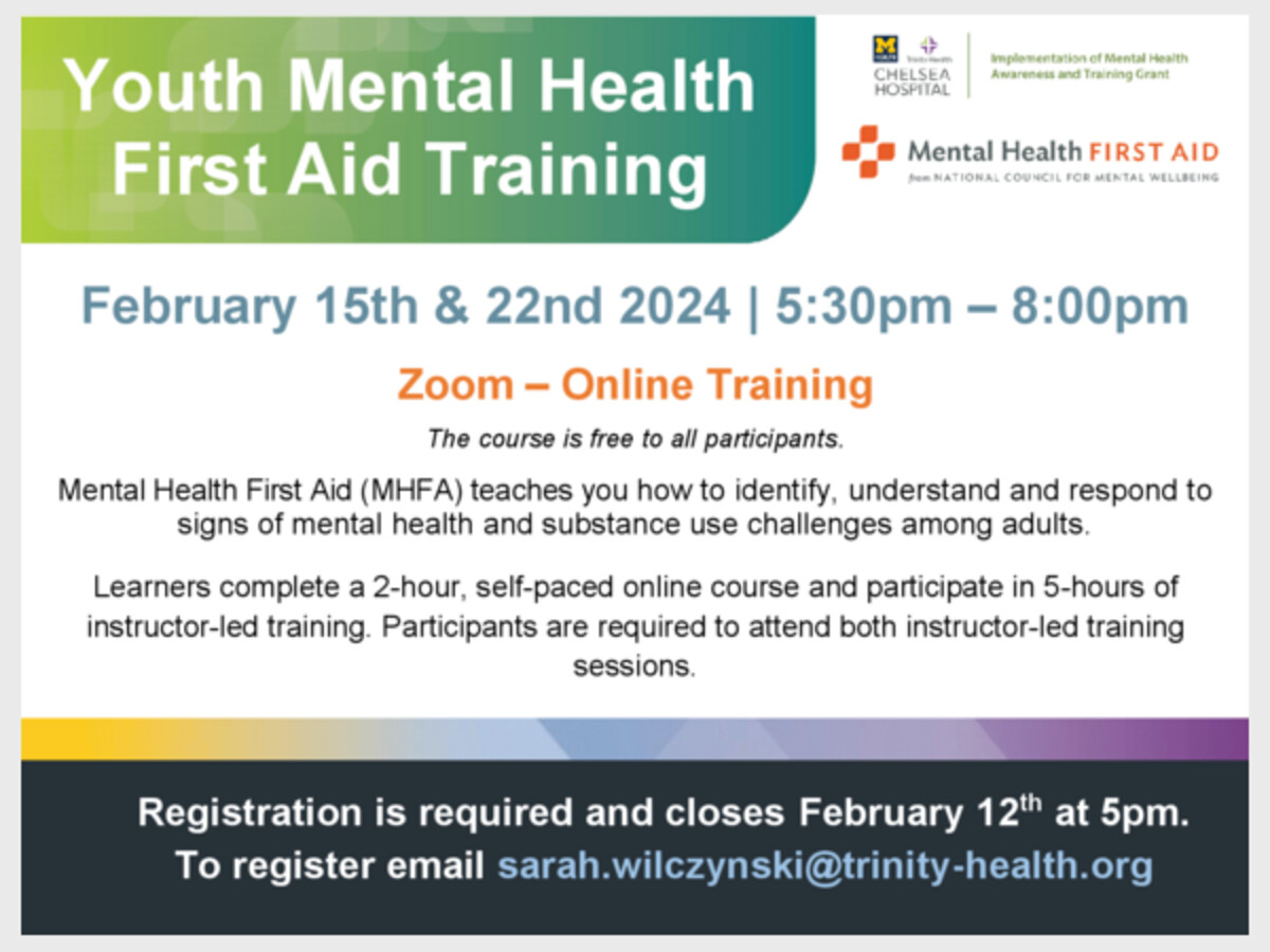 Youth Mental Health First Aid is a training for adults 18+ to be able to recognize and help a youth (primarily ages 10-18) who may be experiencing a mental health or addictions challenge or is in crisis. The course introduces common mental health challenges for youth, reviews typical youth development, and teaches a 5-step action plan for how to help young people in both crisis and non-crisis situations.