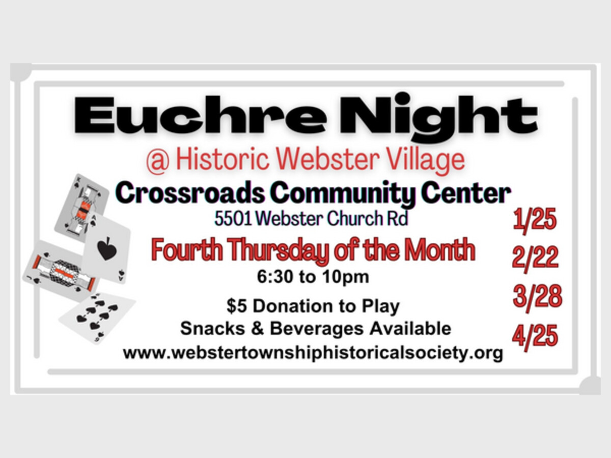 The Webster Township Historical Society invites you to our monthly Euchre night at Crossroads Community Center in Historic Webster Village. Check-in begins at 6:30, games begin at 7.