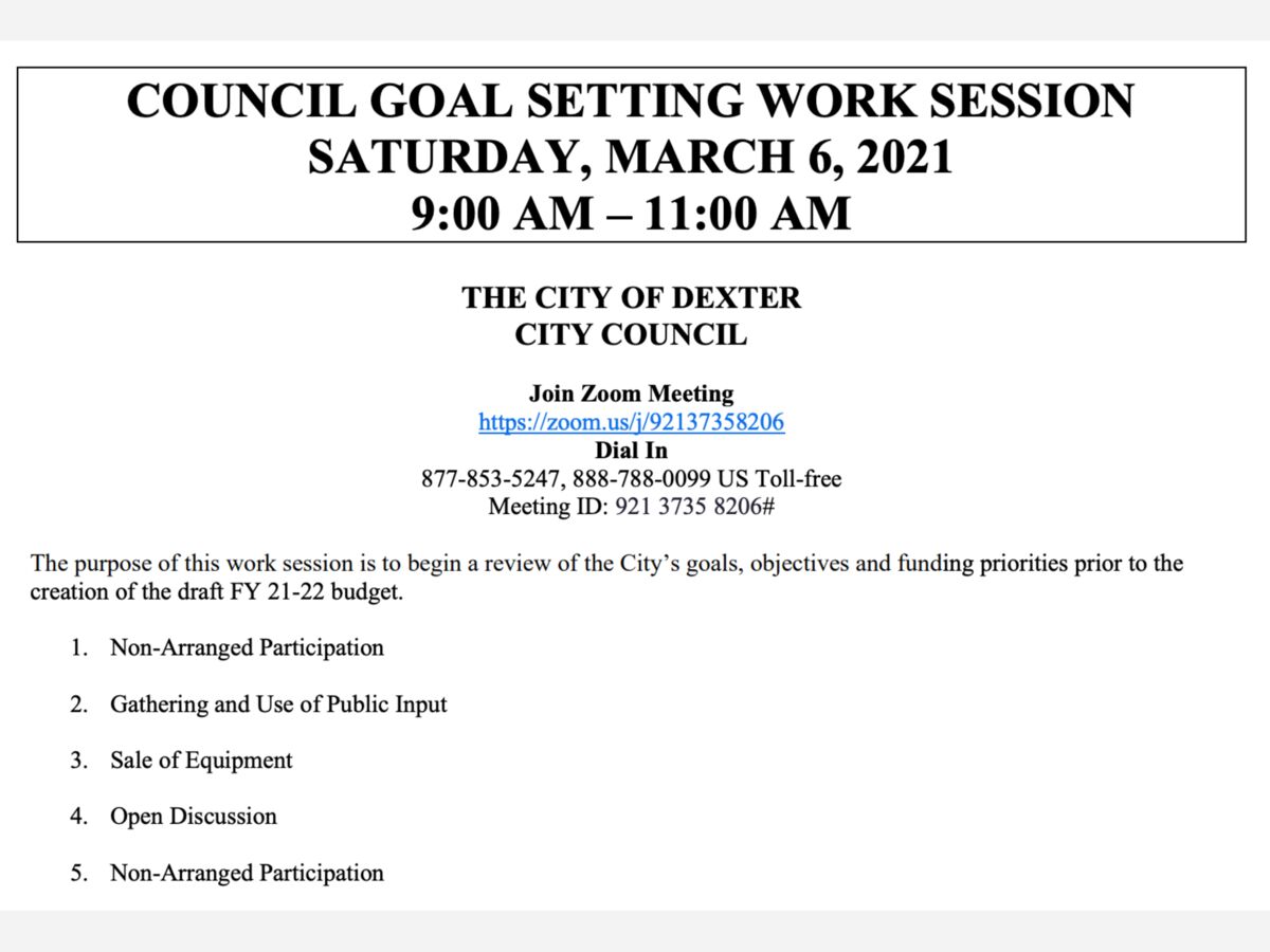 Work Session Agenda: https://www.dextermi.gov/City_Council/2021/Agendas/2021-03-06-CC-A-WS.pdf