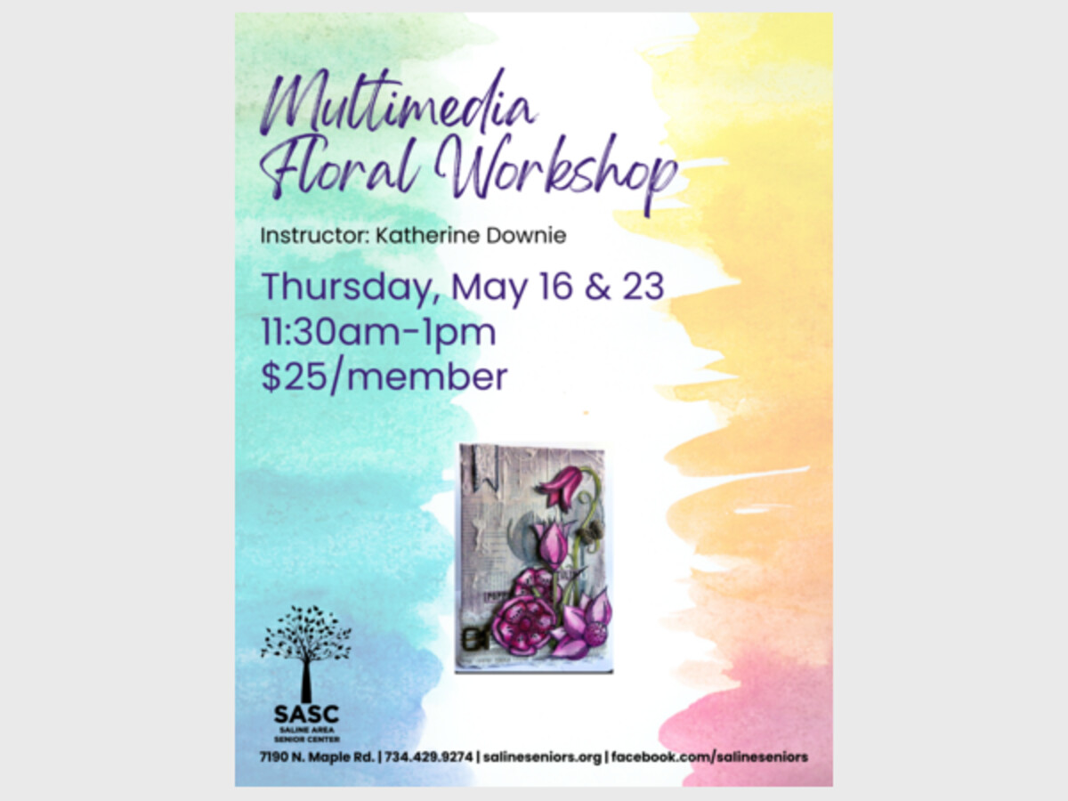 Let your inner child free in this class as we explore multimedia! There are so many benefits to making art in your older years including increased cognitive function and self-esteem. In addition to painting, Katherine will have a variety of materials for you to get creative with while leading you through a neat multimedia floral piece. Materials included. Register at the front desk or online: https://sasc.recdesk.com/Community/Program/Detail?programId=2445