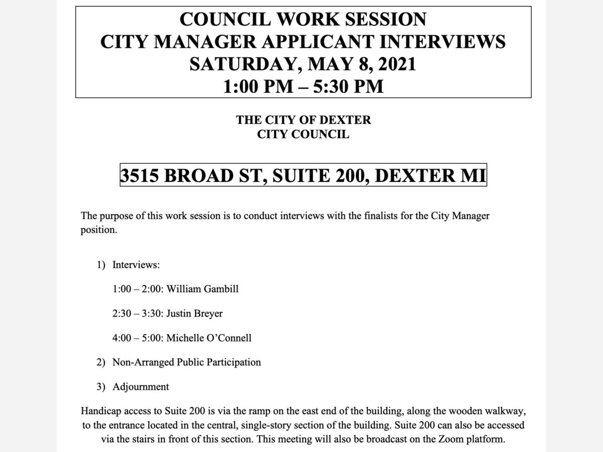 The City of Dexter City Council will interview the three finalists for the city manager position. See the meeting packet for each finalist’s application materials. The job posting discussed by City Council on 10/26/2020 can be found on page 190 of the meeting packet found here. Public participation is welcome! Please reach out to me and/or my fellow council members to share your thoughts about this important decision.
