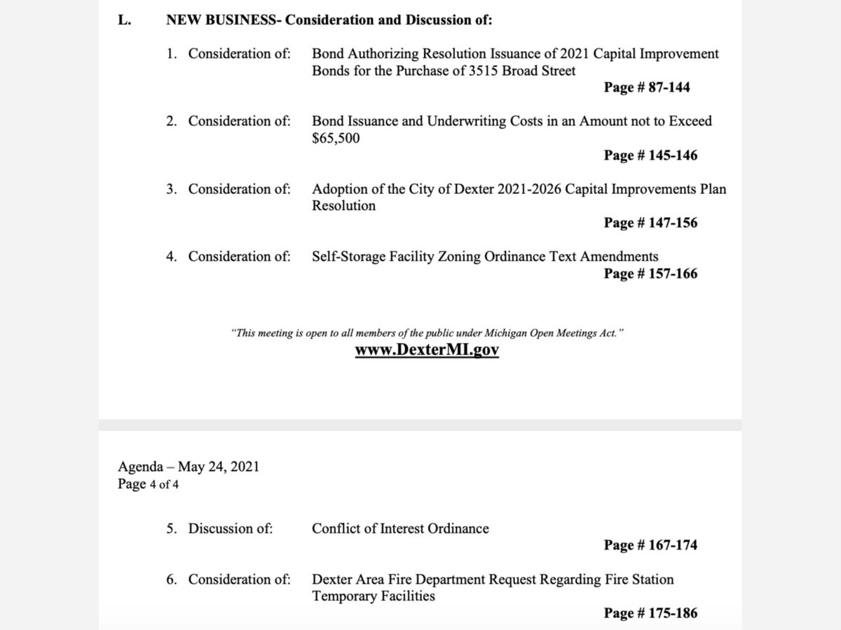 The City of Dexter entered into a purchase agreement to purchase property located at 3515 Broad Street for the location of City Offices (media coverage here).