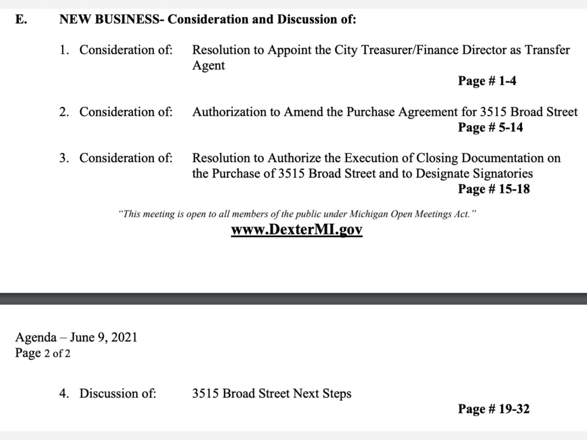 The City of Dexter entered into a purchase agreement to purchase property located at 3515 Broad Street for the location of City Offices (media coverage here and here).