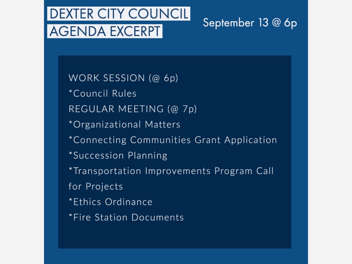 Dexter City Council Work Session (6p) and Meeting (7p) on Monday, September 13 in person (3515 Broad Street) or via Zoom (see below for login/dial-in details)