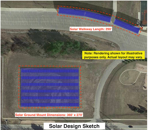 This image is from the Dexter Community Schools website.The DCS webpage on the project and campaign states, “Help us build an innovative solar panel walkway around the bus hub that will provide sustainable energy and reduce electricity costs so we can spend those dollars in the classroom!”