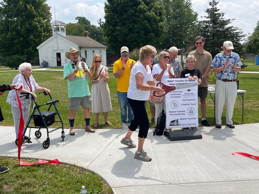 The ribbon cutting officially opened the walkway at the Historic Webster Village. photo by Lonnie HuhmanThese included representatives from the Ann Arbor Area Community Foundation, the Webster Township Board, 5 Healthy Towns and the Webster Township Historical Society (WTHS). The Dexter Area Chamber of Commerce helped with the ribbon cutting ceremony.