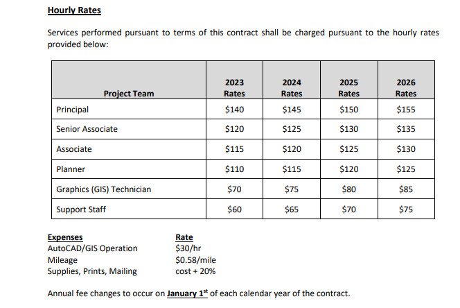 The rate schedule between Dexter Township and Carlisle Wortman. image courtesy of Dexter TownshipSikkenga said, “The planner will build leadership on the planning commission and zoning board of appeals to ensure a unified vision in alignment with the Dexter Township master plan and strategic plan. This will include setting the agenda for the PC (Planning Commission) and ZBA (Zoning Board of Appeals), and recommending agenda items for the Board of Trustees. She will make sure our boards are aware of any items that have fiscal impact, and items that impact quality of life for residents (such as zoning enforcement issues). She’ll identify opportunities to serve our residents better, especially proposing improvements to the zoning ordinance for greater clarity and effectiveness. The planning firm will be able to provide back-up staffing for our in-house permit processing/zoning enforcement position, ensuring uninterrupted service and quick turnaround to our residents.”