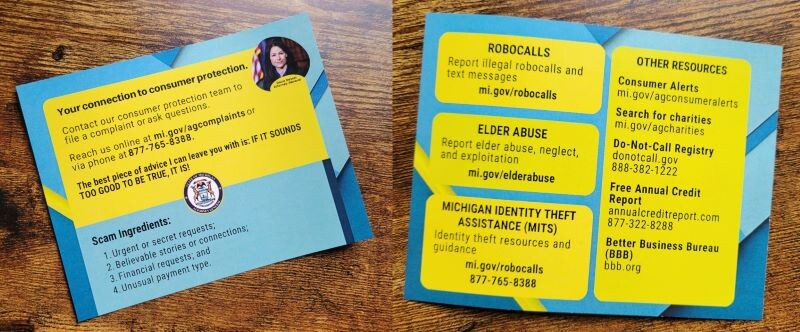 The Attorney General also covered the practice of “spoofing,” where scammers use one of your contacts in the caller ID or a familiar area code to get you to answer the call. “Never trust your caller ID, even if it says ‘Chase Bank’ or ‘State of Michigan,’” said Nessel.