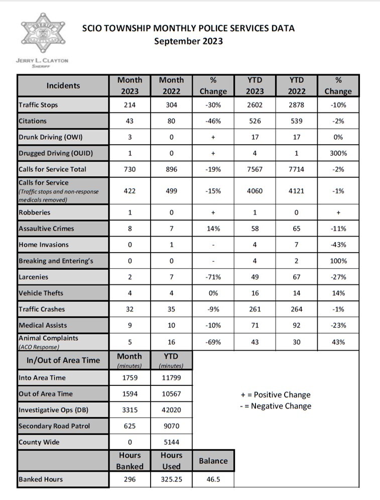 In September 2023, Deputies responded to 730 calls for police service in Scio Twp, down from 896 the previous year for a 19% decrease. Total calls for 2023 (Jan-Sep) are 7,567, down from 7,714 for the same period last year for a 2% decrease.
