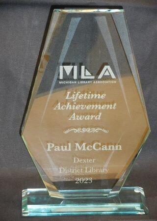 Paul McCann, Director of the Dexter District Library, received the 2023 Lifetime Achievement Award from the Michigan Library Association (MLA) at its annual conference in Kalamazoo on Oct. 18, 2023. McCann received the honor for his 33-year career, 29 of which has been in Dexter as Director.